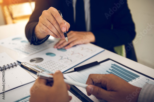 Two business partnership coworkers analysis cost work progress and gesturing with discussing a financial planning graph and company financial during a budget meeting in office room.