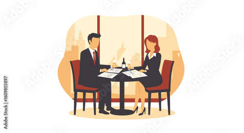 Two business professionals, a man and a woman, sit at a table reviewing documents in a modern office setting.