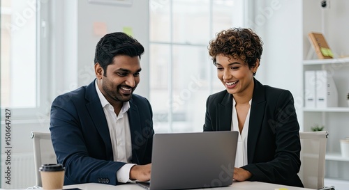 Two business professionals collaborating at a laptop in a bright office