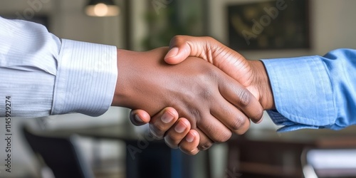 Two business professionals engage in a handshake following a successful business meeting, symbolizing collaboration and partnership in the business world. The handshake represents success and