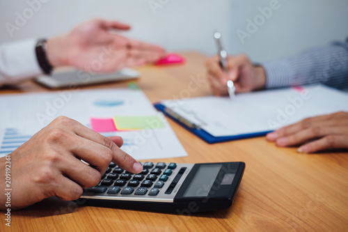 Two business team working and discussing Financial investment on report with calculate Analyze business and market growth on financial document data graph and digital tablet
