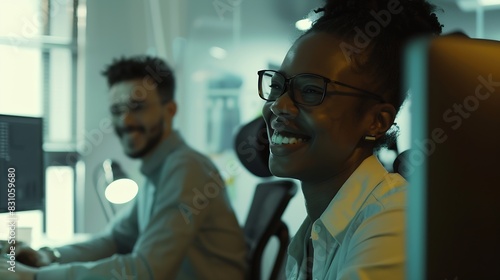 Two business workers smiling happy working sitting on desk at the office : Generative AI