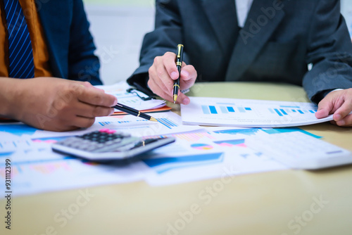 Two businessmen are seated at a desk in an office, engaged in a meeting focused on analysis, finance, and marketing strategies, with documents and graphs spread across the table.