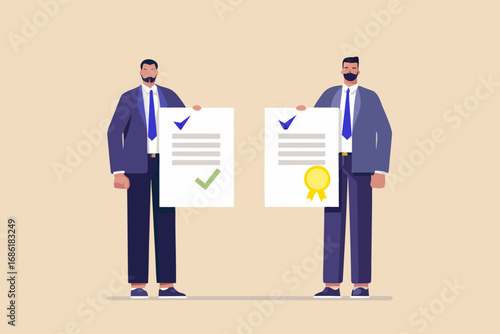 Two businessmen holding documents with checkmarks and a golden seal representing approval and certification