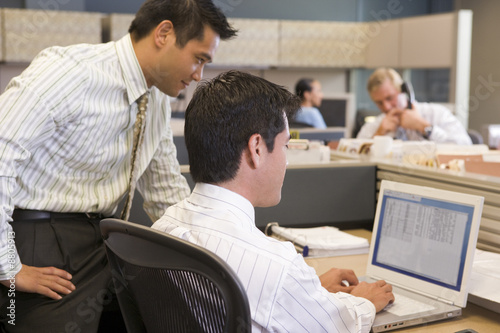 Two businessmen in cubicle looking at laptop
