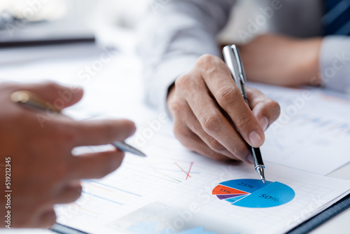 Two businessmen pointed to the material for the meeting, working together to plan to develop and solve common business problems. Concept of business management for growth and quality.
