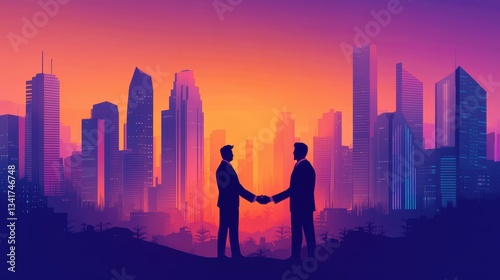 Two businessmen shake hands against a vibrant city skyline at sunset, symbolizing partnership and collaboration.