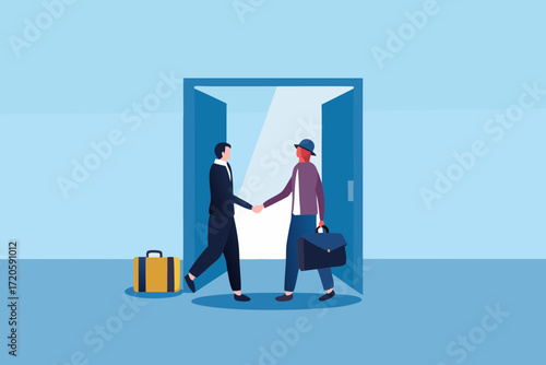 Two businessmen shaking hands at the doorway with briefcases symbolizing a successful deal or partnership
