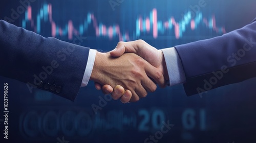 Two businessmen shaking hands, digital background, symbols of agreement and trust.