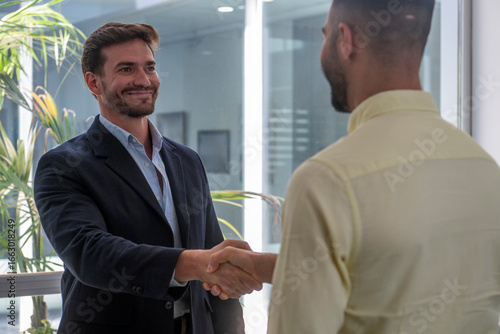Two businessmen shaking hands in modern office, establishing a successful partnership