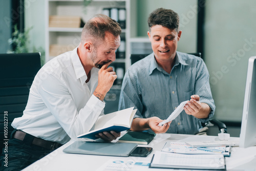 Two businessmen working together Analyze financial reports with charts and graphs while using the calculator to calculate budget, income, taxes, business growth. Startup business idea.