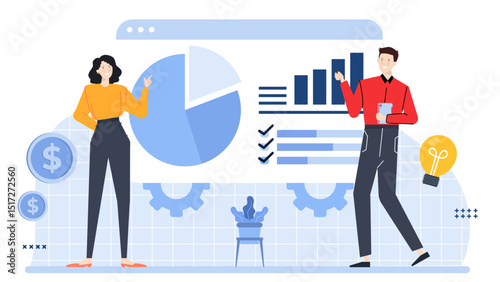 Two businesspeople showing data visuals for a presentation. Suitable for business meetings, reports, financial analysis, and teamwork concepts.