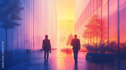 Two businesspeople walking in a modern cityscape with colorful sunset.