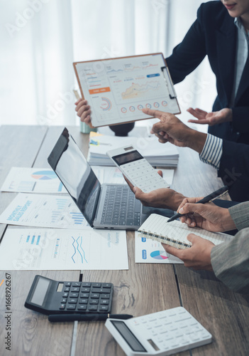 Two businesswoman discuss investment project working and planning strategy with tablet laptop computer in modern office.