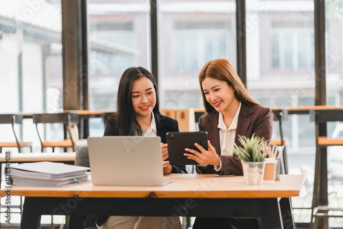 Two businesswomen collaborating at modern office desk with laptop and tablet, smiling and discussing work. Bright natural light enhances professional workspace