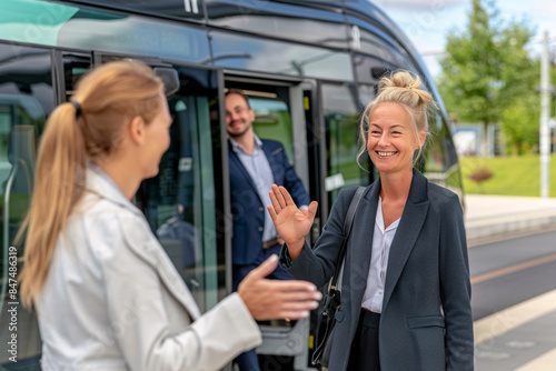 Two businesswomen greeting each other with smiles and a handshake after getting off a tram in a modern urban setting. They appear friendly and professional, reflecting a positive work commute and conn