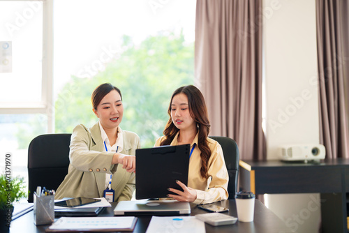 Two businesswomen in formal attire are discussing work in a modern office. One points to the laptop screen while the other observes, focused on a collaborative task