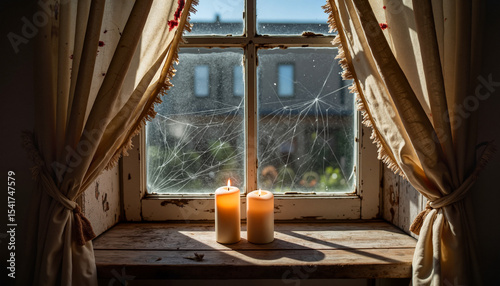 Two candles on wooden windowsill with sunlight and elegant curtains