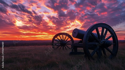 Two cannons on a grassy field during a vibrant sunset.