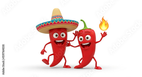 Two cartoon chili peppers wearing a sombrero dance with joy