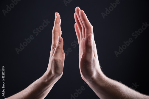 Two Caucasian hands, male and female, on a dark background prepared to touch each other. High-five gesture and tenderness of friendship between man and woman