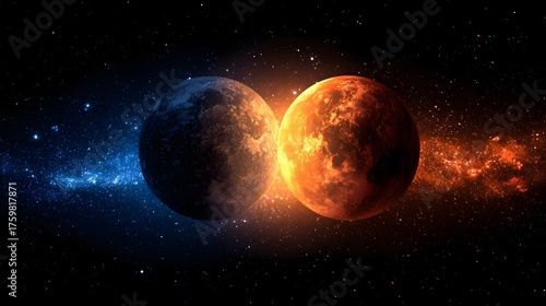 Two celestial bodies illuminate a cosmic expanse of stars and nebulae.
