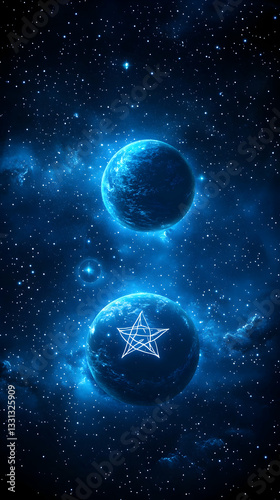 Two celestial bodies in deep space, one adorned with a glowing star symbol