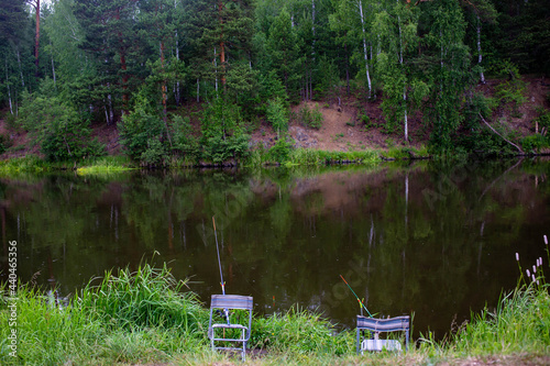 two chairs and two fishing rods are waiting for fishermen on the bank of a quiet river in the evening