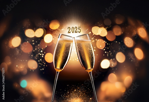 Two champagne flutes clink together, the golden liquid sparkling in the light. The year 2025 is written in gold between them.