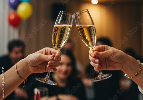 Two champagne flutes clinking in a celebratory toast with friends in the background.