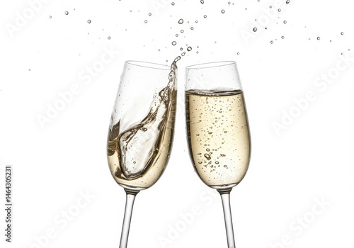 Two champagne flutes clinking together with champagne splashing against a white background and small bubbles floating above