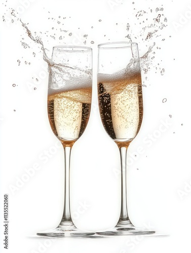 Two champagne flutes clinking with bubbly liquid splashing, symbolizing celebration.