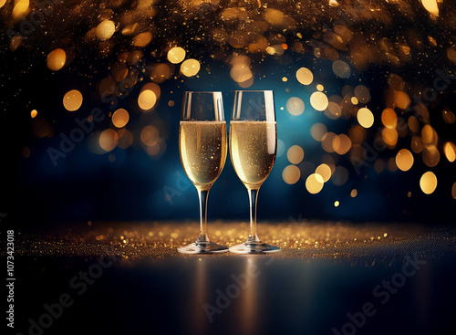 Two champagne flutes filled with bubbly against a dark blue background with scattered golden bokeh.