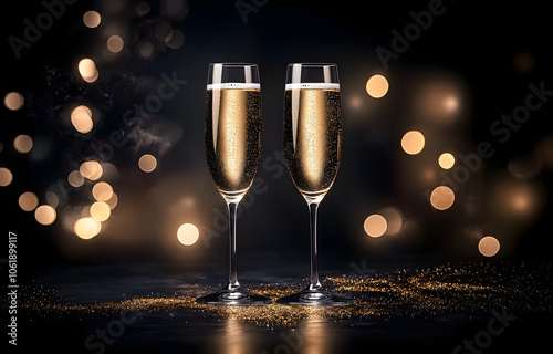Two champagne flutes filled with bubbly stand on a dark surface with gold glitter and bokeh lights in the background.