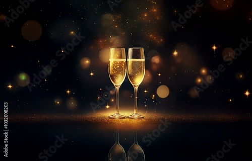 Two champagne flutes filled with sparkling golden liquid stand on a glittering surface against a dark, bokeh-filled background.