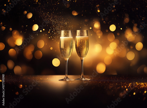 Two champagne flutes filled with sparkling wine sit on a dark surface, with a backdrop of blurry golden lights.