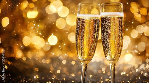 Two champagne flutes on glitter, golden bokeh background, celebration.