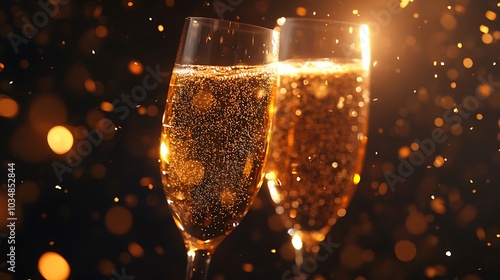 Two champagne flutes toasting against a dark background, golden bubbles and droplets frozen in mid-air, warm glowing highlights, confetti sparkles floating gently,
