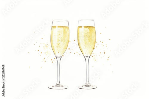 Two champagne glasses toasting yellow drink white background.