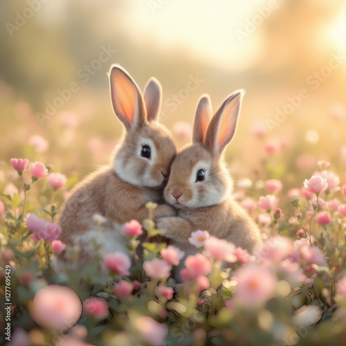 Two charming bunnies cuddle in a serene field of soft pink flowers, bathed in the golden light of a setting sun. This heartwarming scene captures the essence of spring's purity, warmth