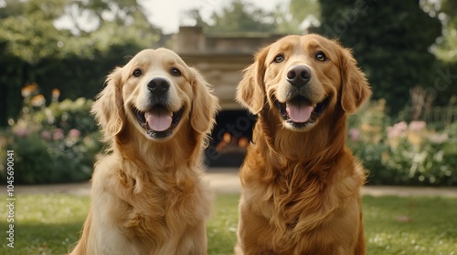 Two cheerful golden retrievers sitting happily in a lush garden setting.