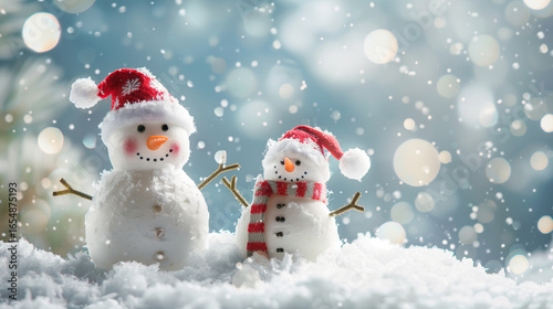 Two cheerful snowmen standing in winter christmas landscape. Merry christmas and happy new year greeting card