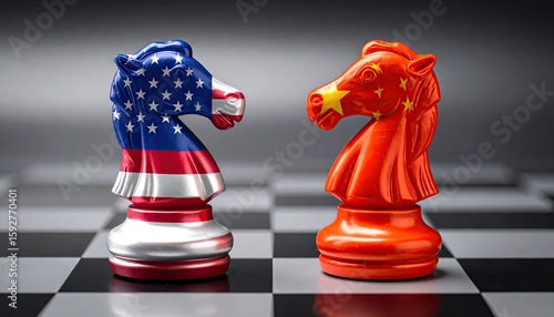 Two chess knights, one American, one Chinese, face each other on a checkered board