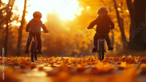 Two children riding bicycles through an autumn forest, surrounded by colorful leaves at sunset