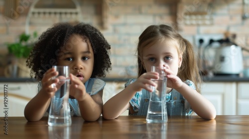 Two children sit at a kitchen table with glasses of water, embodying innocence and simplicity in a warm, domestic setting.