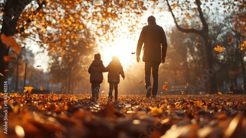 Two children walk hand-in-hand with a parent through a picturesque autumn landscape, showcasing childhood joy and family connection amidst colorful fallen leaves.