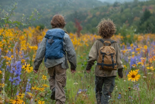 Two children with backpacks wander through a field of wildflowers in the rain, an image of adventure and connection with nature.