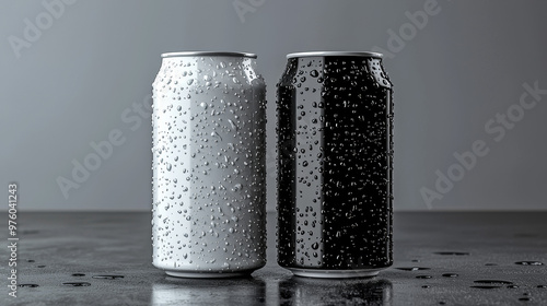 Two chilled beverage cans, one white and one black, with condensation droplets.