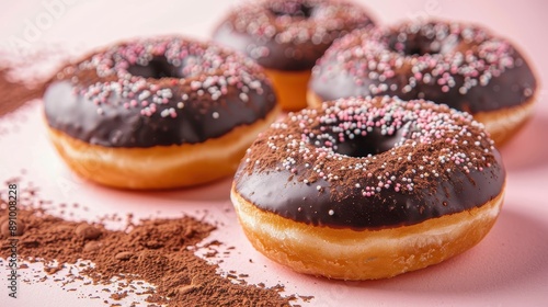 Two chocolate donuts with sprinkles on top sit on a table next to a chocolate bar. The donuts are the main focus of the image, and the chocolate bar is a secondary element