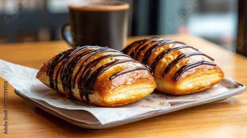 Two chocolate-glazed pastries on a plate, beside a coffee cup.